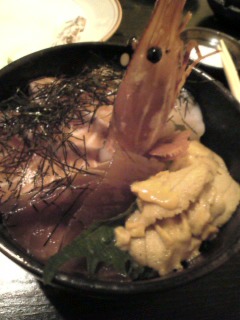 真ん中に、尾頭付き(?)のぼたんエビちゃん♪周りにはホタテ、マグロ、ウニ、サーモンと、あたしの大好物ばっかりガツンと乗っちゃってます(ノ∀`●)